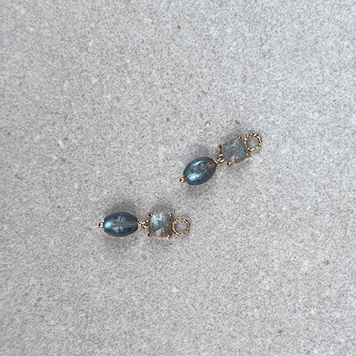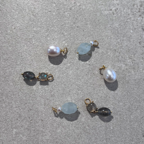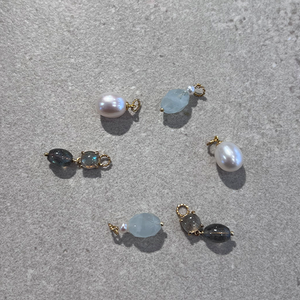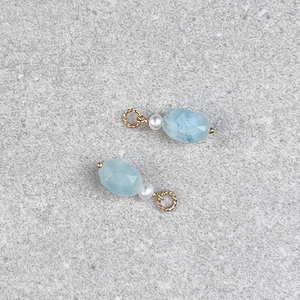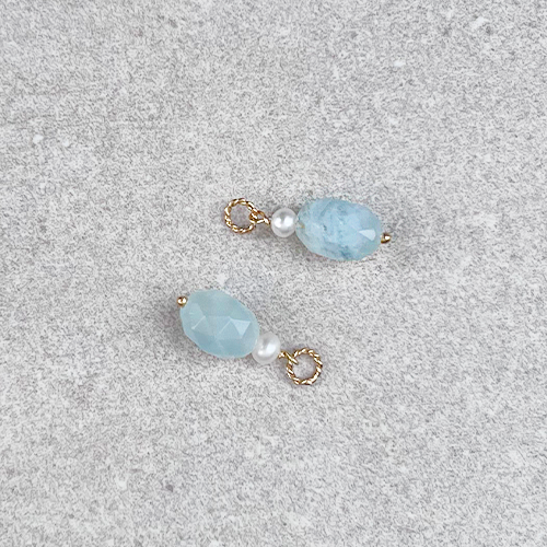 Der andere charm ist mit einem schönen milchigen facettierten Aquamarin-Edelstein besetzt, der mit einer weißen, runden Süßwasserperlen gekrönt ist.